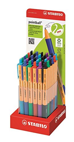 Pens STABILO® pointball® Display. Die Ausführung der Inhalt der Anzeige: sortiert in je 6 Farben: 4 pro ST grün (unauslöschliche), rot, türkis und lila, die jeweils 10 ST blau (unauslöschliche) und Schwarz (unauslöschliche). Hergestellt aus 79% recyceltem Kunststoff. Extrem weich Kugelschreiberpaste für schnelle Eingabe (Strichstärke 0,5 mm). Rutschfeste Griffzone. Druckmechanik. Nachfüllbar mit STABILO Kugelschreibermine. Das Material der Anzeige: Pappe, mit Recycling-Kunststoffeinsatz (PET). Größe (B x H x T): 101 x 264 x 101 mm. Farbe: rot-grün-weiß.STABILO ballpen Punkt Ball, 36er Karton Display