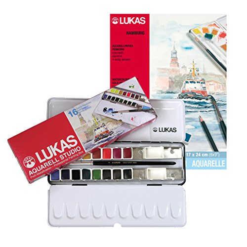 Verkauf Profi "LUKAS AQUARELL STUDIO Metallkasten" 16er Set mit 2 ausklappbaren Paletten + Hochwertiger "LUKAS AQUARELLBLOCK" + AQUARELLPINSEL und BLEISTIFT
